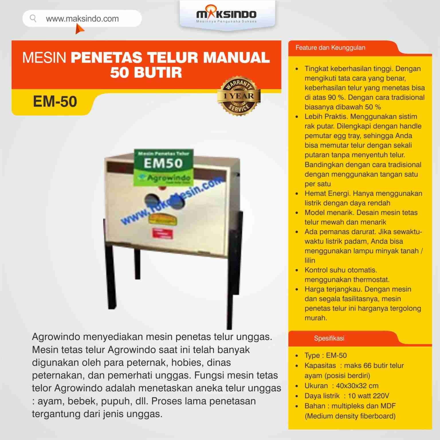 saat ini di Toko Maksindo sudah menyediakan mesin tetas telur dengan cara yang manual 50 butir tipe EM-50. Fungsi mesin ini yaitu untuk menetaskan berbagai macam telur unggas contoh ayam, bebek, puyuh, dll. Dengan menggunakan mesin ini mampu memudahkan usaha Anda dalam memproses penetasan telur dengan mudah secara otomatis sehingga tidak perlu repot untuk membalikkan telur yang ada di dalam mesin penetasan. Mesin ini mampu menjadikan bisnis Anda semakin berkembang dan lebih menguntungkan. Mesin ini sangat cocok untuk para peternak sehingga bisa memudahkan dan meringankan pekerjaannya.